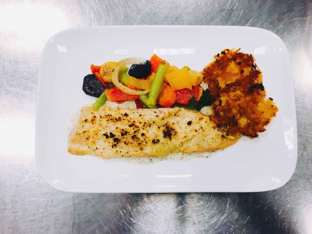 Lachsforellenfilet mit Frischkäse überbacken, mariniertes Gemüse und Rösti
