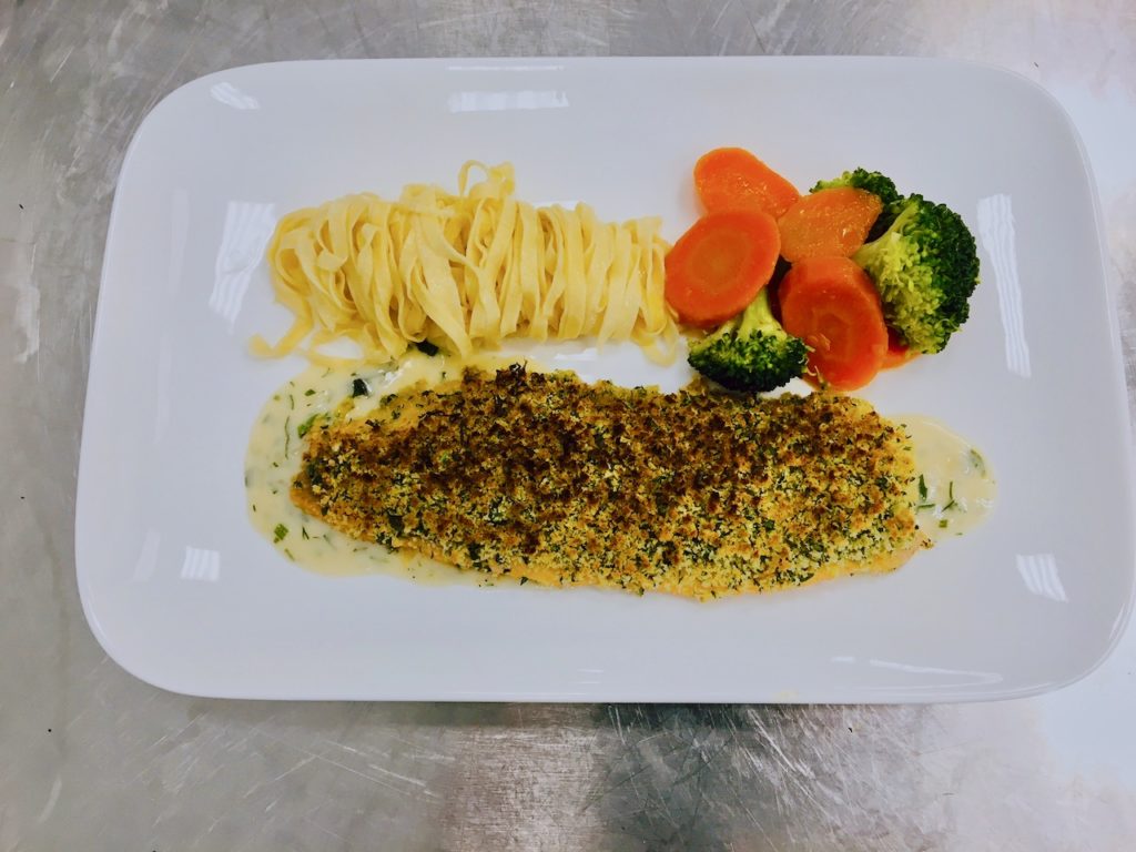 Lachsforellenfilet mit Kräuterkruste, Senfsauce und Fettuccini