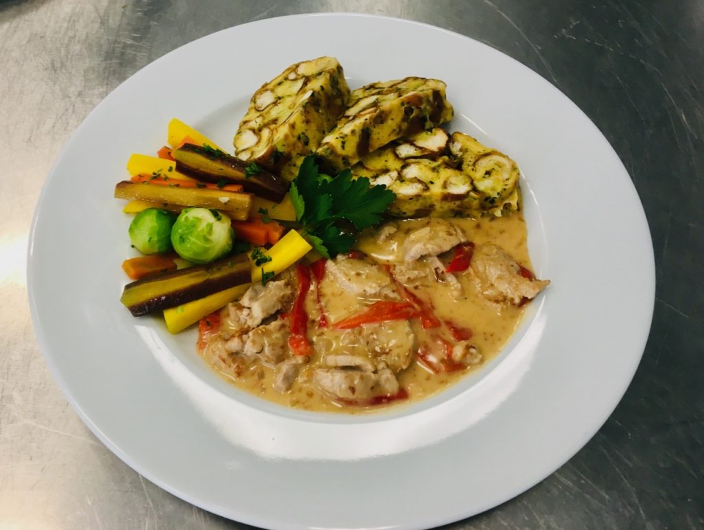 Geschnetzeltes Schweinefilet mit Paprikarahmsauce und Brezenknödel