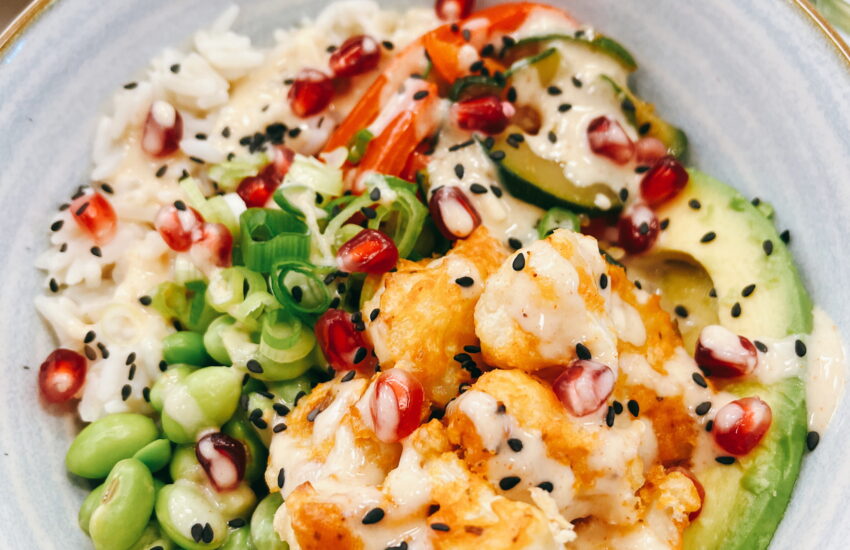Knuspriges Schmetterlings_Huhn Chicken Shawarma Safranreis mit Pistazien Gewürzkarotten Caesar Salad